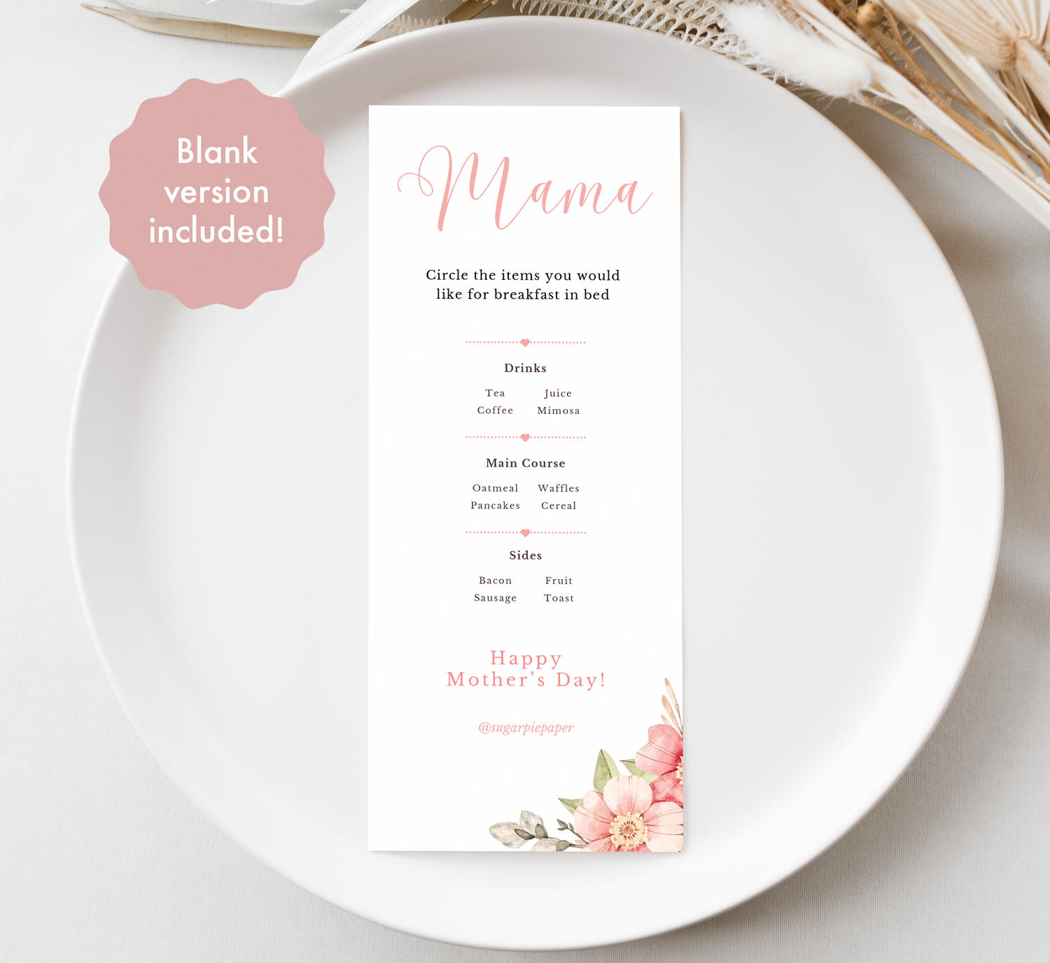 Download this free printable for your family to print out and treat you to breakfast in bed on Mother's Day morning. This design comes with a blank version to write in food items as well. Enjoy!